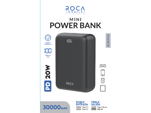 En stock En stock Power Bank ROCA Mini RC-PB-P920 20.000mAh PD20W Entrada: 2 Tipo C Salida: USB + Tipo C Cód.ACC021035